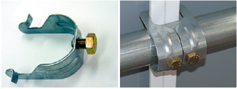 カラーガードフラット鋼板を単管パイプに取り付けるための金具です。